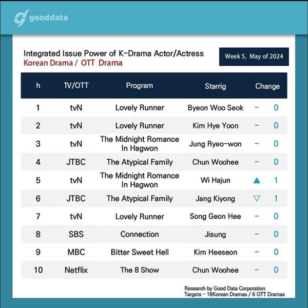 Yesterday, South Korea’s Good Data Corporation released its latest Buzzworthiness rankings of Korean actors and actresses for Week 5 of May, 2024 and, as you might expect, Lovely Runner actor Byeon Woo Seok is in the #1 spot.