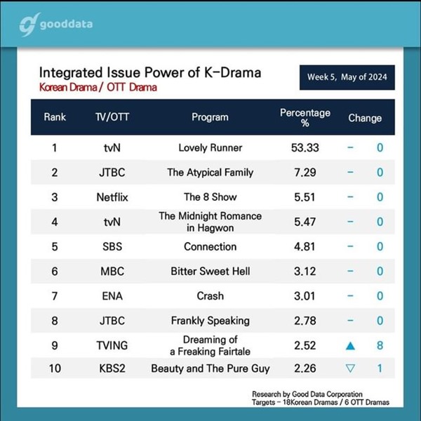 Lovely Runner was also the #1 show on their Buzzworthy OTT Drama chart (see above) grabbing 53.33 percent of the data assessed, and with its closest rival, The Atypical Family at #2, only being able to garner 7.29 percent of the interest.