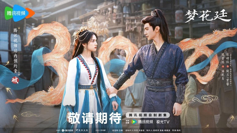 Historical mystery romance drama Chasing Dreams has reached 300,000 reservations on Tencent Video, with a sweet poster of main leads Chen Zhe Yuan and Zhang Jing Yi released by the streaming platform in celebration.