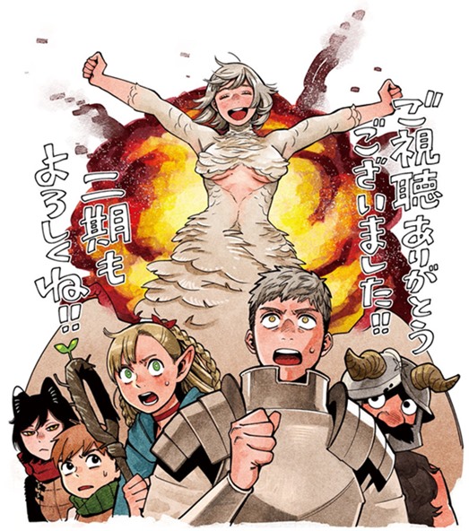 Along with the new Delicious in Dungeon celebratory visual, the anime’s X account thanked fans for the last six months, during which time the anime was airing, and reminded them they will continue to provide merchandise, collaborations, events, and more while its second season is in production.