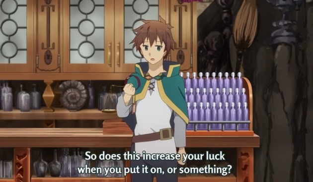 Kazuma goes to Wiz’s magic shop where he finds a magic choker that gives the wearer one wish. Being Kazuma, he decides to put it on only to find out from Wiz he now has only four days to live if the wish is not granted.