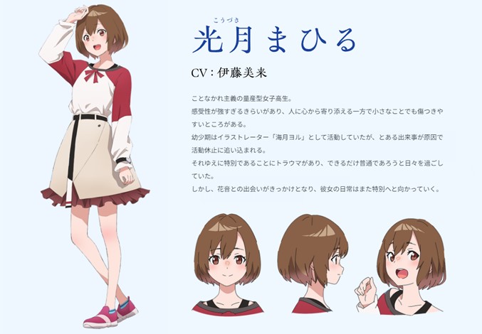 The official website for the upcoming original anime Jellyfish Can’t Swim in the Night has released character visuals for protagonist Mahiru Kozuki (see below), along with a cute new character trailer that gives us an insight into the high schooler’s life and personality.