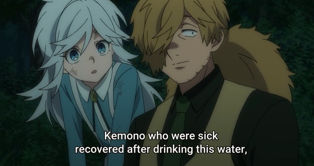 The episode ends with Akio talking to himself about the Kemono still left in the woods, and how he can find one that will let him make more golden webbing.