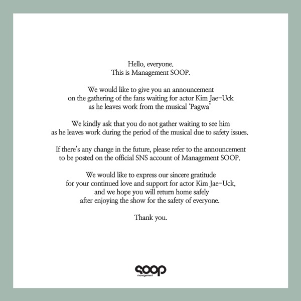 Such, apparently is the situation with Korean actor Kim Jae Uck, whose agency Management SOOP has just announced — in Korean and English (see notice below) — that they would appreciate fans NOT waiting for him after he finishes work on his current project — starring as the character Bullfight in the stage play ‘Pagwa‘ — and attempts to go home.