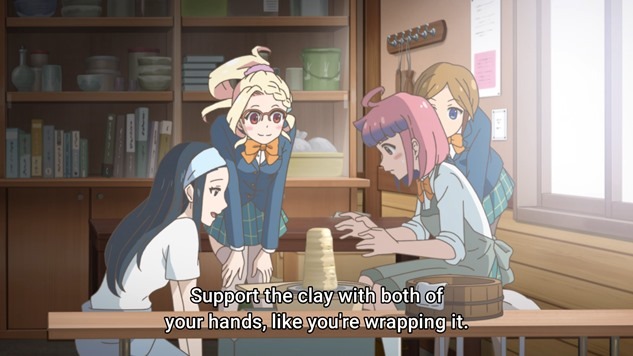 Touko then shows Himeno the seat where her mother used to throw pots and, after a flashback where she remembers her mother making pots, she suddenly says “I want to try making pots myself”.