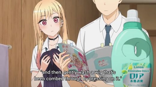 The episode starts with Marin and Gojou washing her cosplay wig, which is sweaty from the event. But, as Marin watches Gojou talk, roses suddenly start to appear around his head.