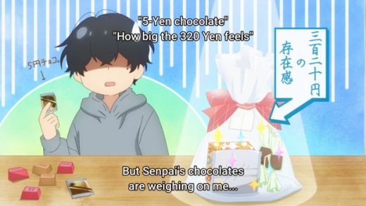 But, he plucks up courage and gives chocolate to Sasaki anyway, while making every excuse he can think of to Sasaki why this isn’t romantic at all.