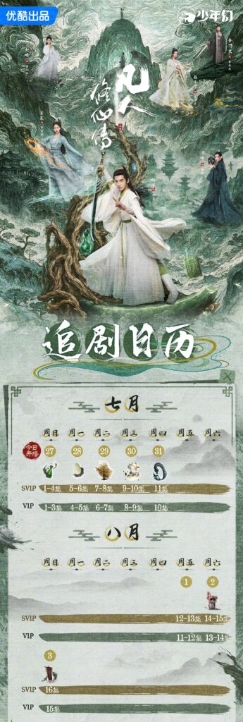 The three graphics that were created for The Immortal Ascension release schedule feature the main cast in the first visual, male lead Yang Yang in the second, and Wang Duo in the third.