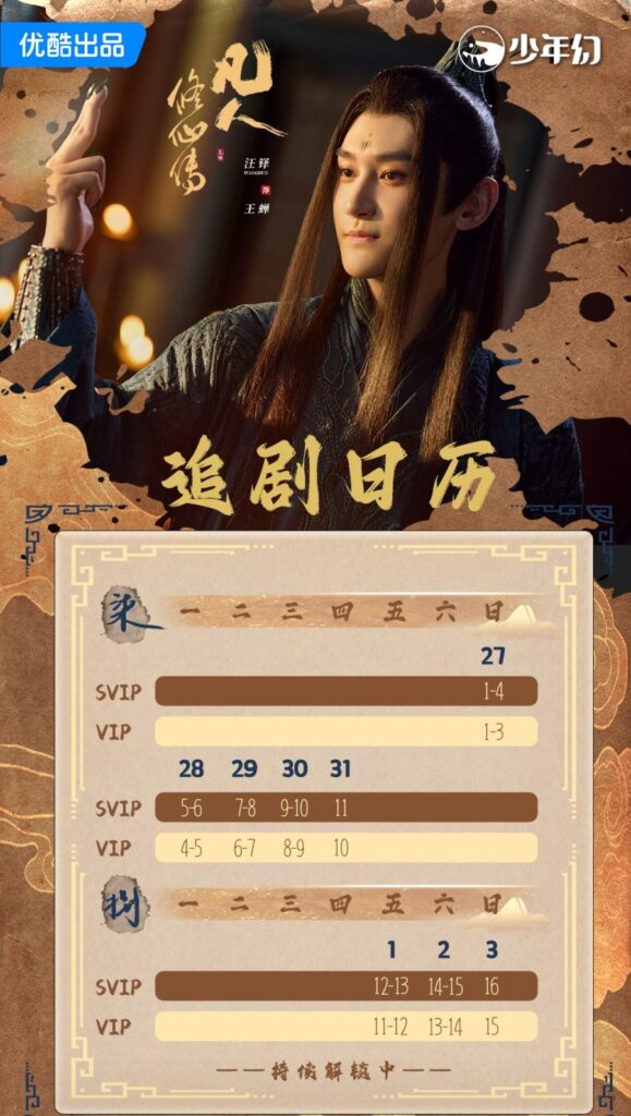 The episode release schedule for the first nine days of the upcoming Chinese drama The Immortal Ascension has been announced and, for anyone who has watched YOUKU for a while, it’s pretty much what you’d expect.