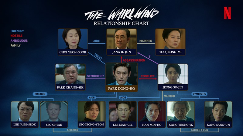 Like any complicated political drama, the South Korean Netflix series The Whirlwind can be quite confusing when it comes to the relationships between each of the characters in it.